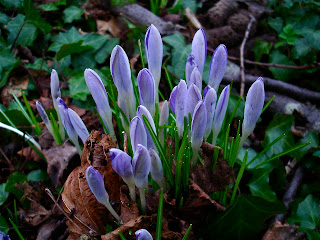 In het Leidsche Hout kom ik een groepje Winterakonieten tegen, deze zijn natuurlijk niet wild evenals de vele soorten Krokussen die je hier kan vinden. De bolgewassen die je hier vind zijn zelfs geen Stinsen Planten, het Leidsche Hout is namelijk in de crisisjaren van de vorige eeuw aangelegd in het kader van de werkverschaffing en is dus nog een relatief jong bos van zo'n 80 jaar oud. Oud Poelgeest daar en tegen is al vanaf 1724 "in cultuur" toen de Leidse hoogleraar Boerhave het landgoed kocht en er een soort dependance van de Leidse Hortus van maakte en er vele bijzondere planten aanplantte waaronder natuurlijk ook Stinsen zoals Holwortel, Vingerhelmkruid en diverse andere bol-, knol- en wortelstok gewassen.